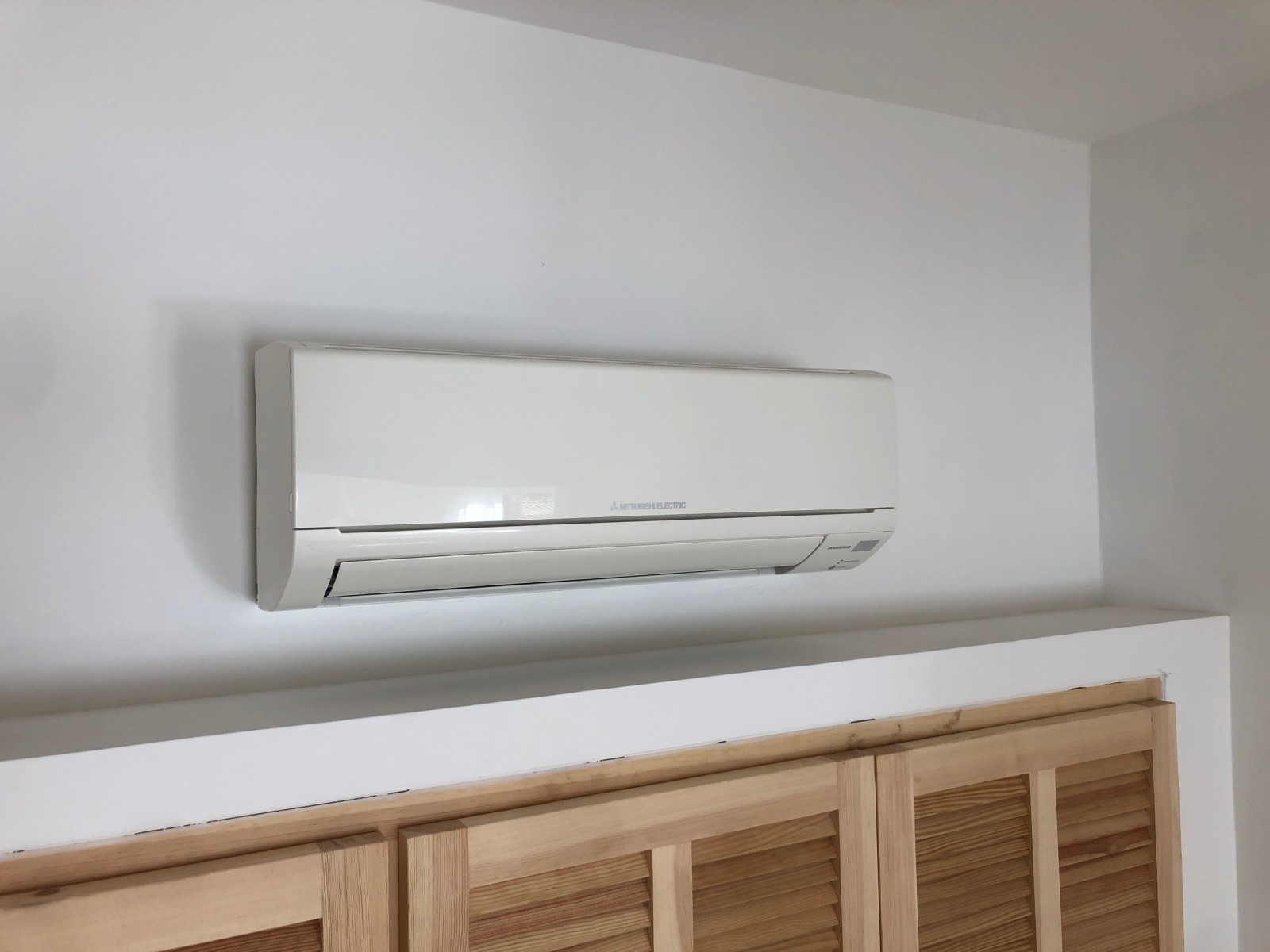 Pose d’une unité de climatisation Mitsubishi dans cette villa pour assurer un appoint chauffage dans le salon, en complément du réseau de radiateurs, et surtout répondre aux besoin de rafraîchissement en été.
