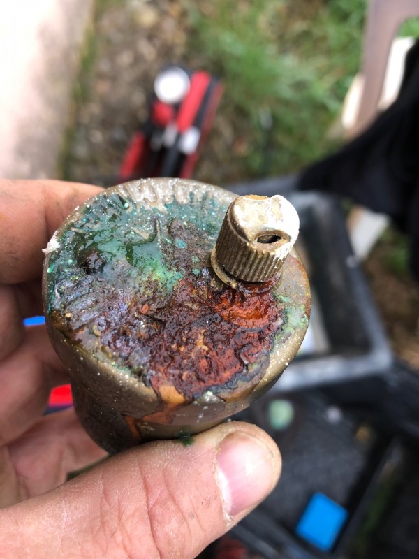 Un raccord bronze était micro-perforé. Tous les joints étaient fuyants et à changer. Il faudra d’ailleurs revenir pour changer les joints toriques des raccords de tube aux collecteurs de chauffage. Je n’avais encore jamais vu de fuites à ce niveau sur planchers chauffants.
