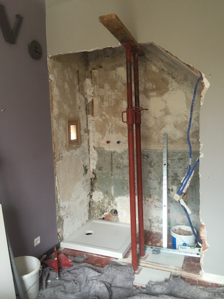Dans cet ancien placard sous l'escalier, nous aménageons un espace douche et vasque.