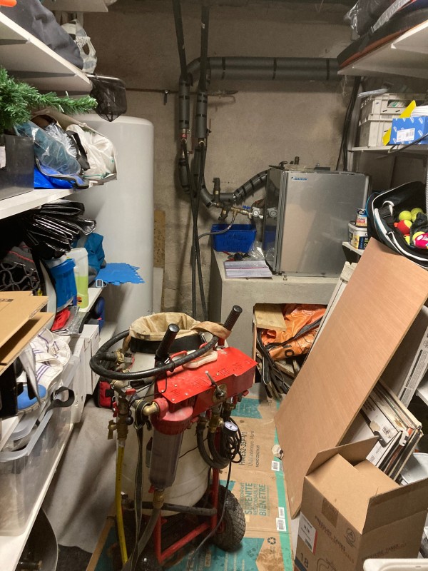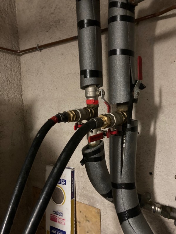 Cependant il a fallu modifier une liaison en fer en vide sanitaire, trop abîmée et comportant un point haut sans purgeur, sur le radiateur acier du salon, lui même alimenté à l’envers. Ultérieurement, ce radiateur a été découplé et testé dehors sous pression. Il semble toujours mal fonctionner alors que ce n’est pas un problème d’alimentation. Aussi, la présence de vannes installées pour son découplage, facilitera une opération de changement de radiateur.