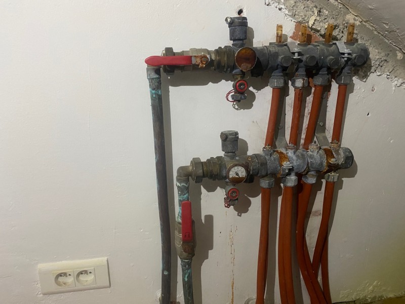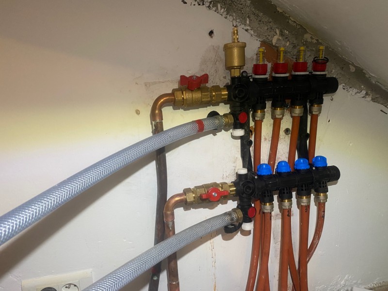 Les deux collecteurs en laiton fortement abîmés ont été remplacés par deux collecteurs de synthèse avec débitmètres, plus adaptés au fonctionnement d’une PAC réversible avec rafraîchissement du plancher.