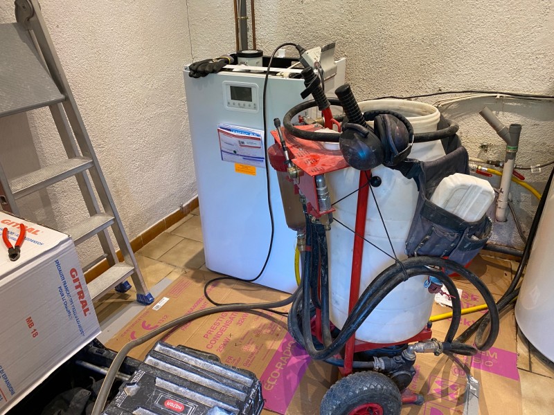 chaudière condensation Frisquet après un sérieux désembouage effectué sur le réseau de chauffage de 16 radiateurs alu. Le conduit en amiante n’a pas été réutilisé, l’objectif étant de passer sur une solution de fumisterie totalement étanche en double conduit avec ventouse en sortie murale, à l’arrière de la maison.