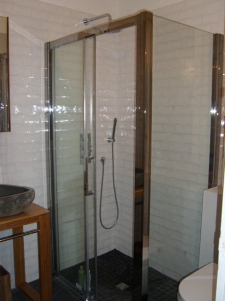 Entièrement refaite à neuf, ce petit espace d'un appartement d'un vieil immeuble à Aix en Provence, a été aménagé pour recevoir une douche italienne avec parois de verre, un WC, un plan de vasque et un sèche serviette.
