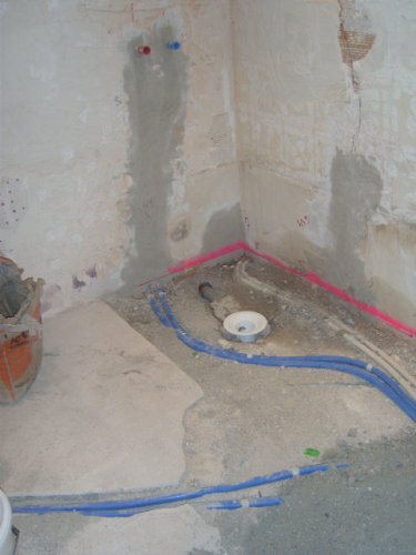Le sol a été cassé pour recevoir une dalle maconnée avec une bonde de douche italienne.