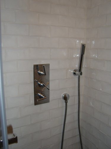 Le carrelage rétro type "métro" a été marié avec une robinetterie encastrée rétro.