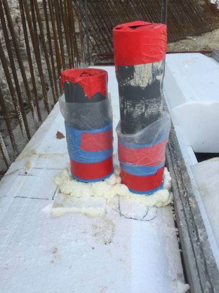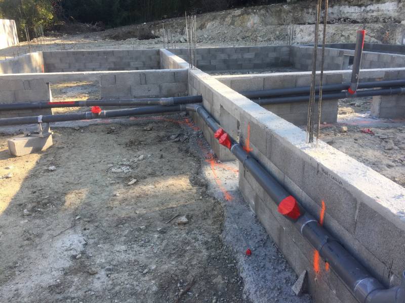 traversées en dalle des conduites d'évacuation ou d'alimentation ont été gainées par un PVC de diamètre supérieur, permettant leur dilatation et leur éventuel remplacement facile.