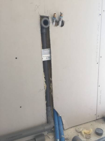 d'alimentation et d'évacuation sont encastrées pour sortir juste au droit des appareils, et une sortie à joint lèvre du PVC d'évacuation est placée pour permettre une libre déconnection du siphon de vasque ou d'évier, et un entretien aisé.