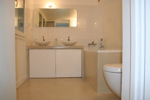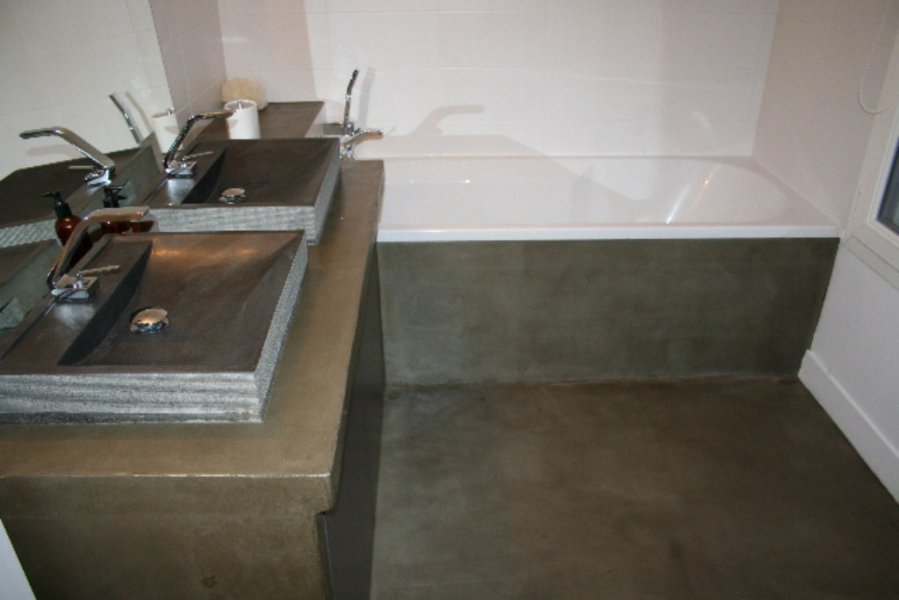 Une salle de bain a été crée à la place de l'ancienne chaufferie. Une autre a été implantée dans une chambre. La salle de bain en place a été entièrement refaite. Le béton ciré a été choisi pour l'ensemble des surfaces, associé à un carrelage sur la douche italienne.