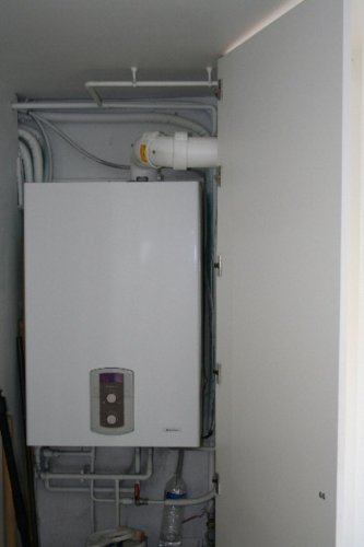 Une nouvelle chaudière à condensation a été implantée dans un placard en utilisant le réseau de radiateurs en place.