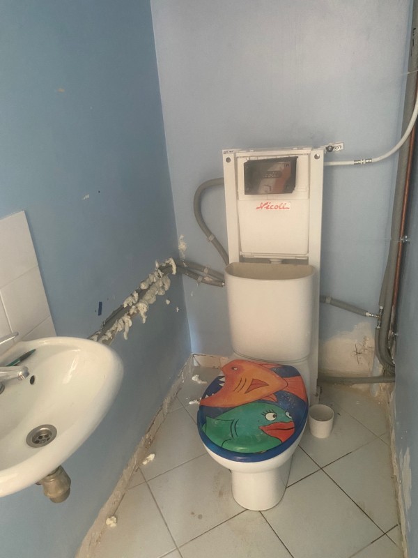 Ici, un WC suspendu NICOLL a été posé et raccordé, provisoirement à l’ancien toilette, pour les besoins du chantier.