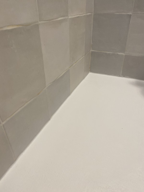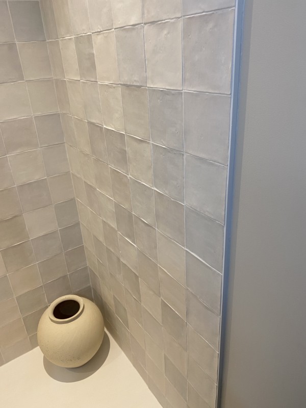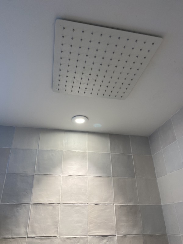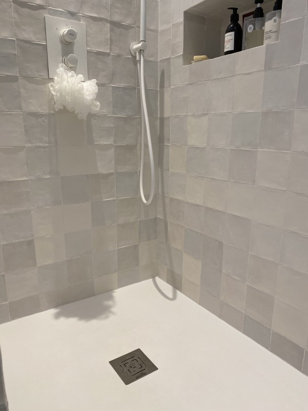 L’espace douche entièrement carrelée est séparé par une cloison et intègre un bac à douche extra plat résine effet Beton et une robinetterie encastrée avec souchette et grande pomme de douche en plafonnier.