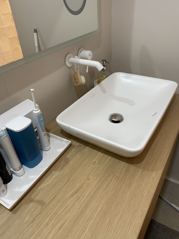 Une jolie vasque Villeroy et Boch et un robinet encastré rend l’espace agréable et laisse la moitié du plan de meuble disponible.