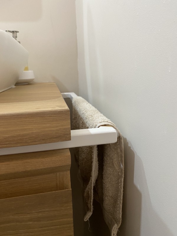 Le meuble de vasque en bois massif a été suspendu au mur, avec renforts de fixation.
