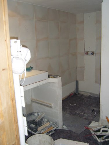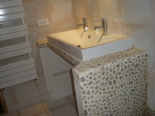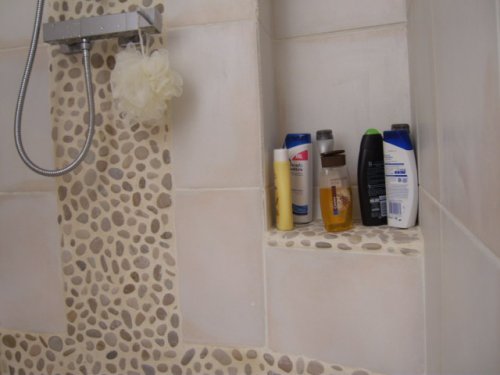 L'espace douche, recouvert de galets, a donc été surélevé par rapport au reste du sol.