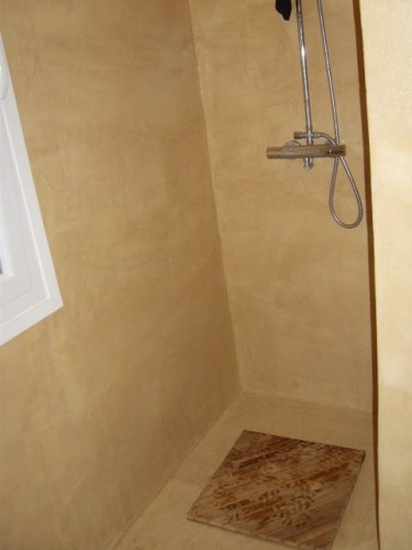 L'ancien bain a fait place à un espace de douche à italienne, également en béton ciré.
