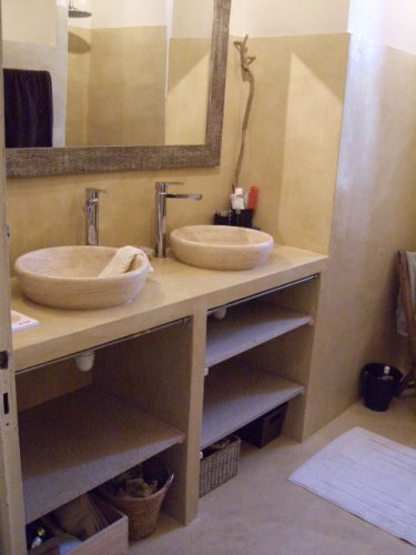 Le bidet a été enlevé et l'espace gagné totalement affecté à un plan double vasque.